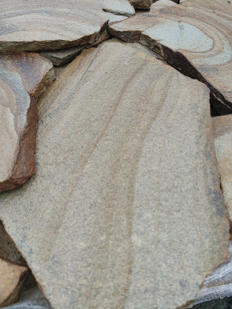 Песчаник жёлтый с разводами - для работ по мощению дорожек и площадок на землю и грунтовое основание, а также на песчано-цементно-щебёночное основание.
